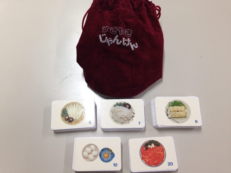1セットグループになった人が家族として協力し、5種類のすき焼きカードをじゃんけんで集めるゲームです