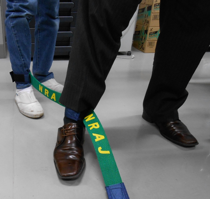 1セット10人一組でベルトをつけ、むかでの足のように動かしタイムを競います