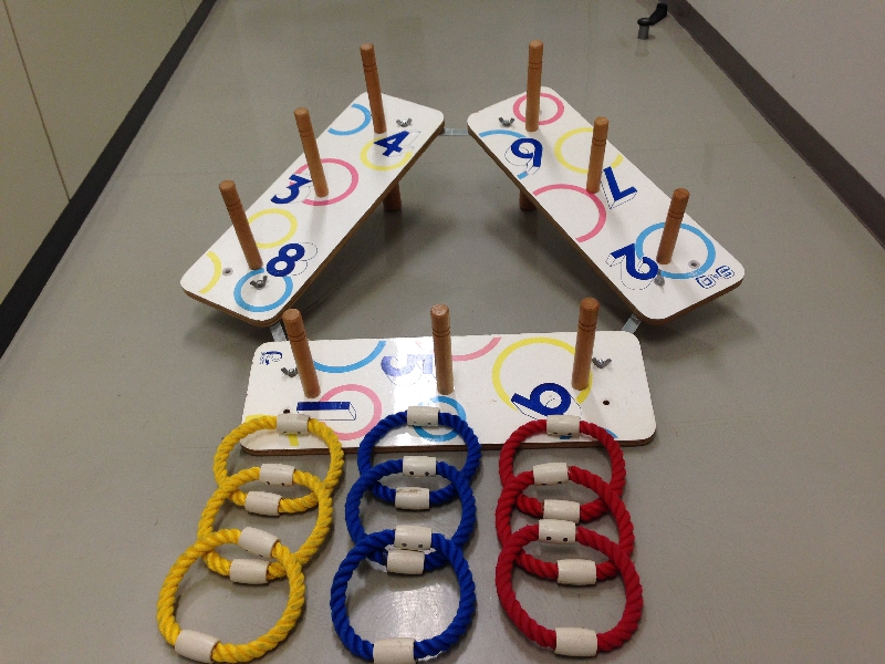 黄1セット、赤1セット(1セット10個)向かいあった2人がまとめて投げたリングをいくつキャッチできるか楽しみます