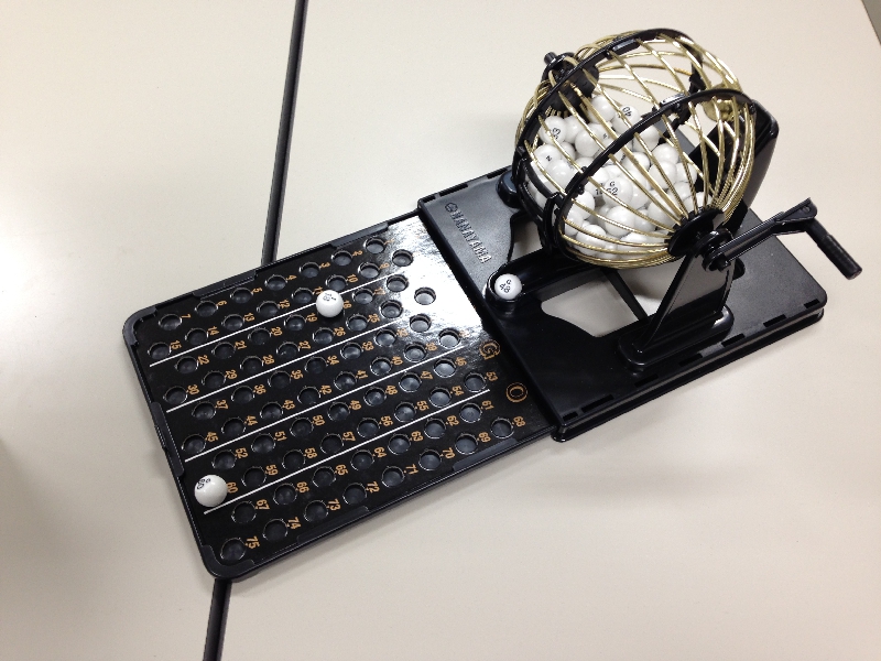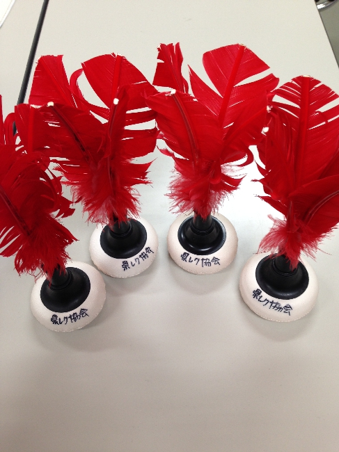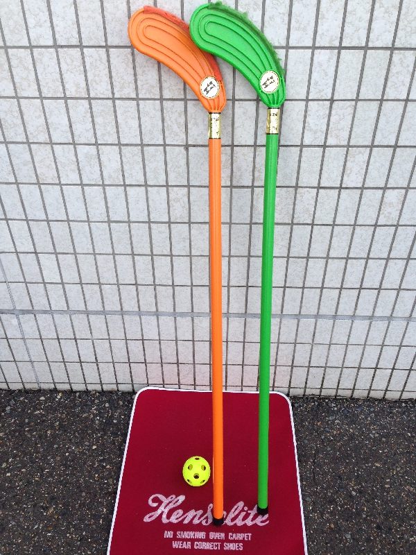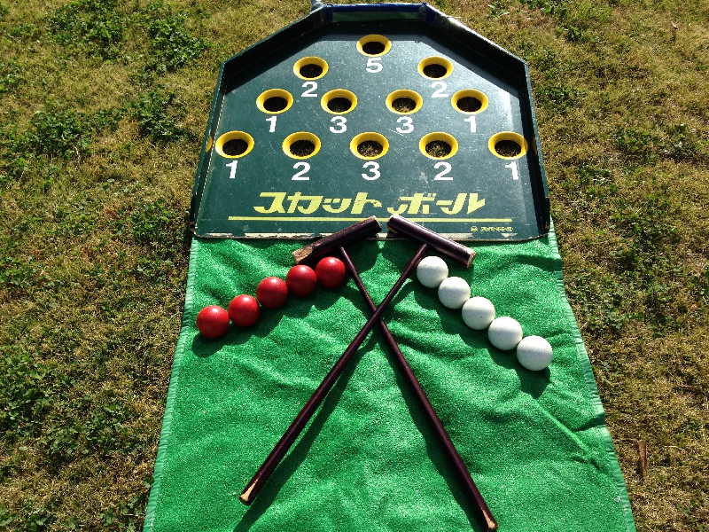 1セット(赤5コ 白5コ)的となる台の穴にスティックでボールをいれ得点を競う競技です