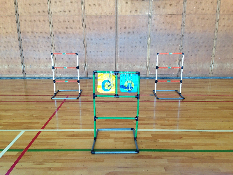 屋外用5セット 室内用2セット両チーム5個ずつクッブ(角材)を自陣に並べ、丸棒を投げて相手陣地のクッブを倒していくスポーツです